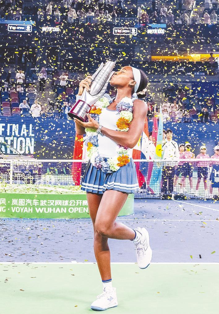 10月12日晚,高夫在武汉光谷国际网球中心击败佩古拉,成为武汉公开赛冠军。当他获胜时,他高举球拍,大声欢呼,眼中闪烁着胜利的光芒,与激动的观众热情互动。