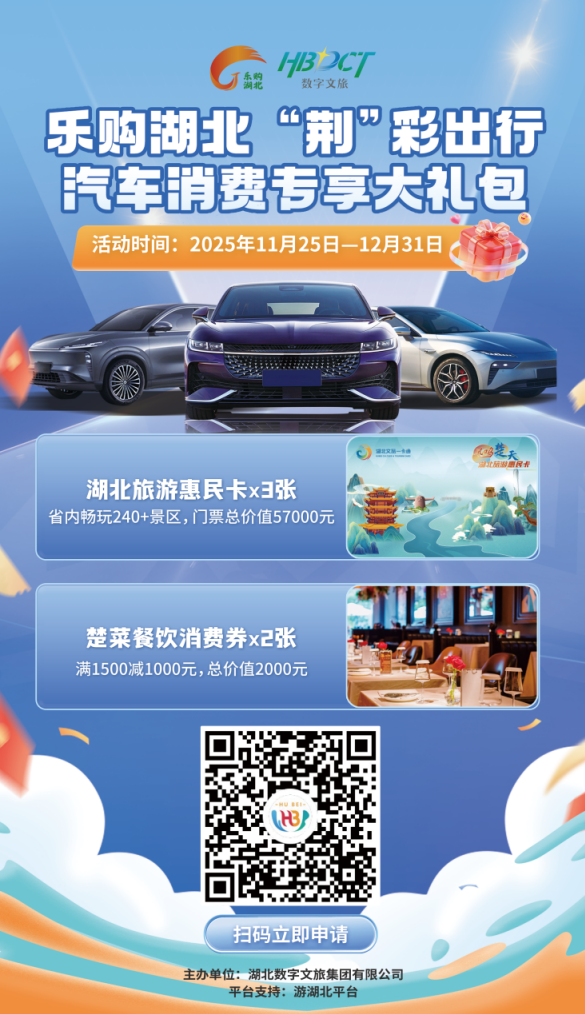 荆楚网(湖北日报)(通讯员 黄凯)为进一步释放消费潜力,创新打造“汽车+”跨境融合消费场景,湖北数字文旅集团将于11月25日至12月31日推出“多彩北京乐购湖之旅”汽车消费计划,限量1万辆。活动旨在联合汽车、文化旅游和楚美食餐饮三大领域,让消费者在购车的同时享受“行湖北、游湖北、品湖北”的综合福利。