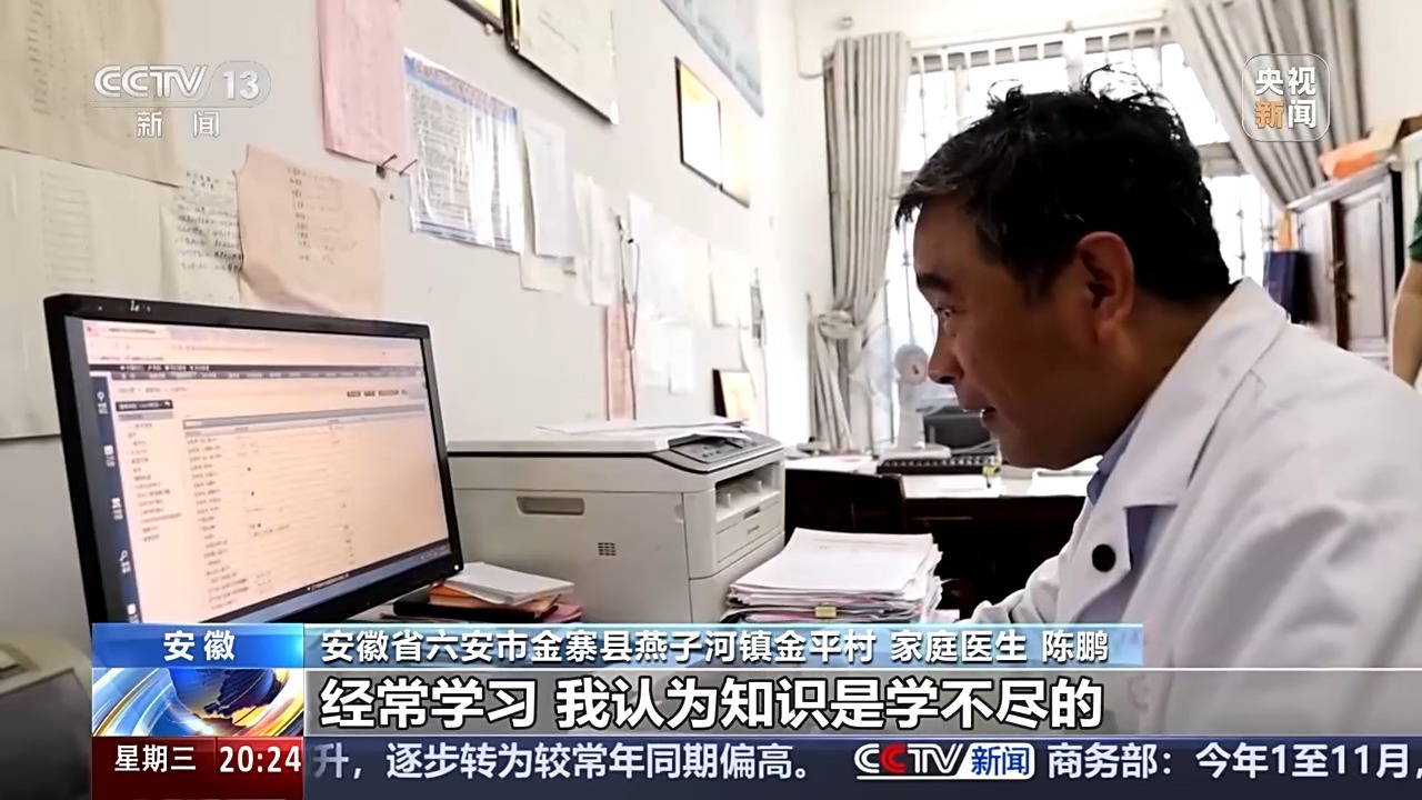 清晨,安湖省六安市金寨县燕子河镇金平村,家庭医生陈鹏(57岁)背着医疗包走进村敬老院。这位“老人”有30年村医经验,测血压、听症状并检查伤口。自2016年成为家庭医生以来,他一直负责村里8000多名签约村民的医疗服务。