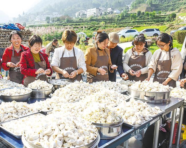 10月28日,秭归县茅坪镇西口坪村,五位老人在一场吸引数千人的饺子宴上共同庆祝百岁生日。西口平村人口4887人,其中60岁以上的村民有1000余人。通过宿酷节的敬老活动,村里爱老敬老的风俗已经深入人心。 (湖北日报记者何帆供图,通讯员郑家瑜、郝明熙、石莉、王玉文提供)