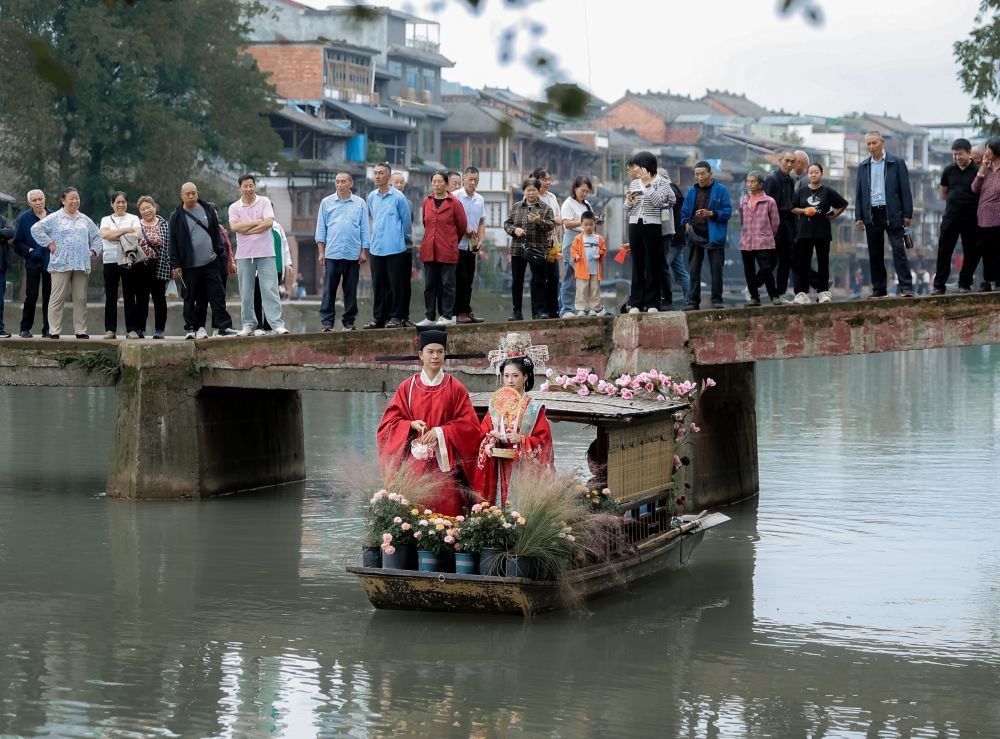 国庆期间,成都邛崃镇家宽古镇举办水上婚礼。 (图片提供:报道组)