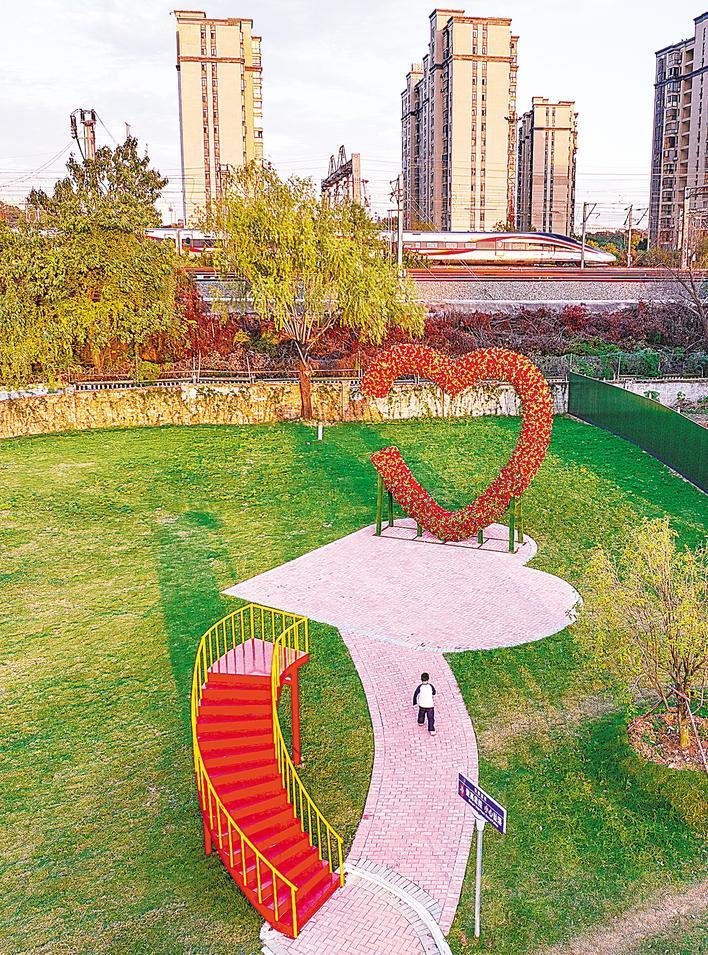 在11月13日建成开放的武汉火车站艾尚红山体育公园,您可以登上观景楼梯,与“复兴号”合影留念。 (湖北日报全媒体记者 朱西勇 提供)